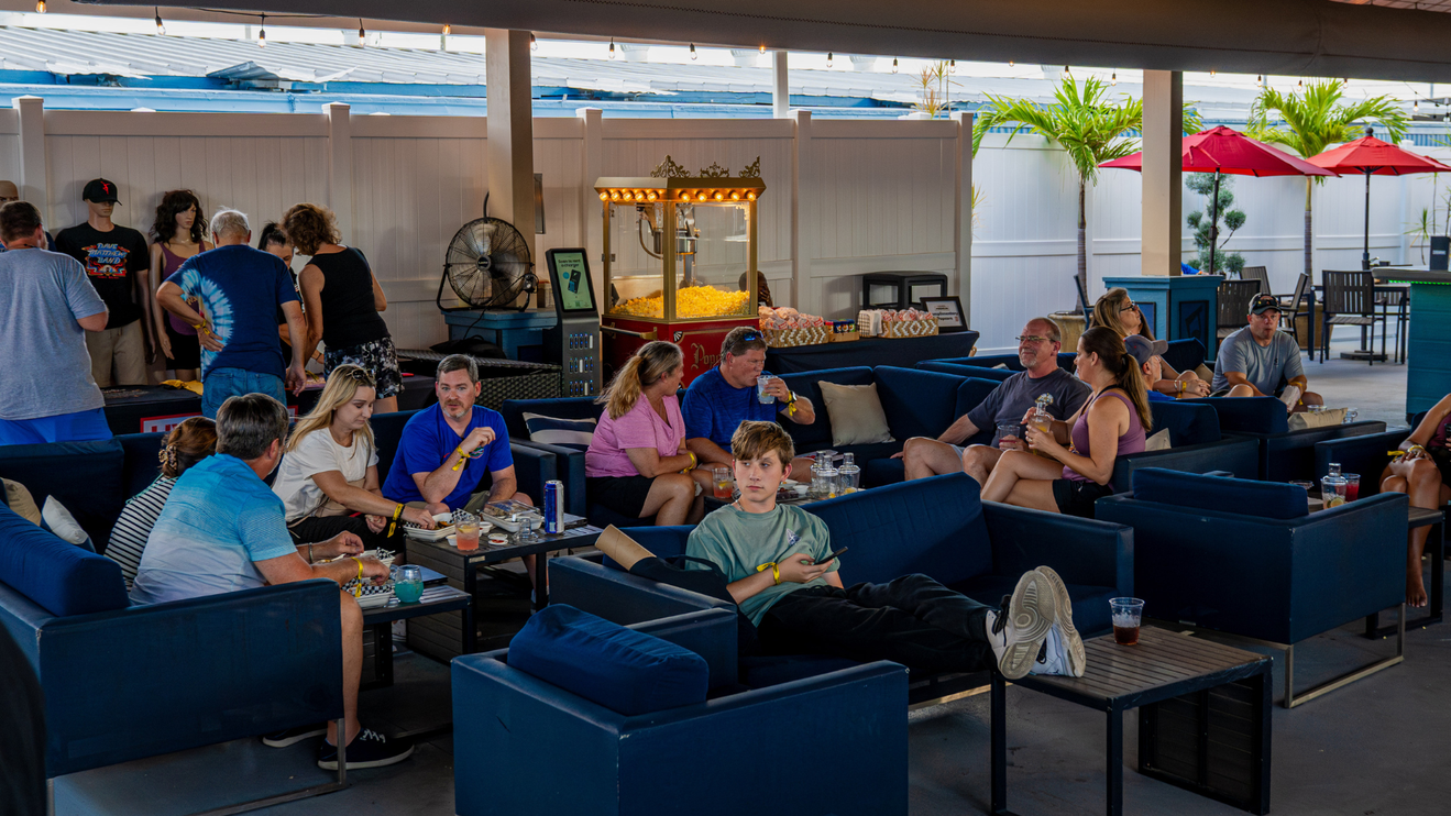 Beat the heat and grab your friends to hangout in the comfort of shaded seating, fans, and plush seats.
